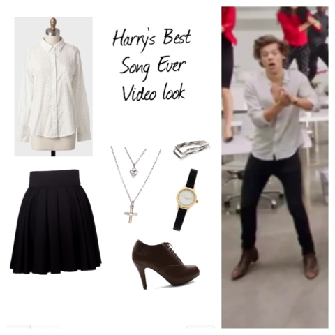 Harry's look was a little tricky but it was nice because he has so many accessories to work with. I Absolutely love Harry's look this is very much something he would wear on a normal day. Harry's look is quite posh and classy in a laid back way (he can also go I'm trying to be hipster.. and that head band is another story) and I really love that. This is probably the outfit I'd be most likely to wear so I really do love it. So first the shirt he's wearing is a button up shirt it looks solid at first bit it is white with lots of small light grey Polkadots. It took a while to find a blouse that matched that but I finally did and I really do like it.Hasn't wearing a jacket it Something over like the other boys but he made up for it in Accessories. Harry's left a few buttons undone on the shirt but I'd suggest on a girl leaving it buttoned to give the nice collar look. He is wearing black skinny jeans but I paired it with a black high waisted pleated skirt. I love this skirt and was thinking it would look really nice if you did that thing wear you tuck the shirt in to the skirt Loosely. For the first of Harry's Accessories he wore a wrist watch.his had a thick strap but I did a thin one, I think it's a bit more feminine. He was wearing a necklace with a long chain and a small cross pendent. I picked a double chained layered necklace with one cross pendent and one small jeweled heart. Harry was also wearing one silver ring. I did two wire silver knuckle rings but this part is really up to you so any ring you like. Finally for the shoes. I have a privet love hate reflation ship with Harry's shoes he wears the same ones all the time part of me wants him to get new ones yet I like the ones he has.. They're dark brown dress she's so for a Women's version I picked a bark brown leather heeled lace up shoe I really live this look I think it's posh and clean and just really nice.